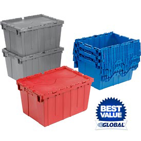 Safely and securely ship and distribute materials with these durable, affordable shipping containers. Interlocking lids are permanently attached using steel hinges. Raised lip edges allow secure stacking. These distribution containers are molded from high density FDA approved polyethylene. Attached lid containers allow nesting when not in use with lids open for compact storage and to help reduce return shipping costs. Molded grip handles have an integral hasp to accept cable ties for security. Sold in carton quantities. Plastic containers are available in Gray, Blue and Red. Add the optional Dolly Base for easy transport of your plastic containers.